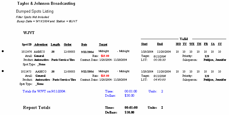 Use this report to print a list of spots that are in the bump list for a specified bump date range.