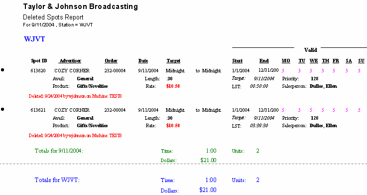 Use this report to print a list of spots that are in the deleted list for a specified deletion date range when deleted off of a log by an operator.