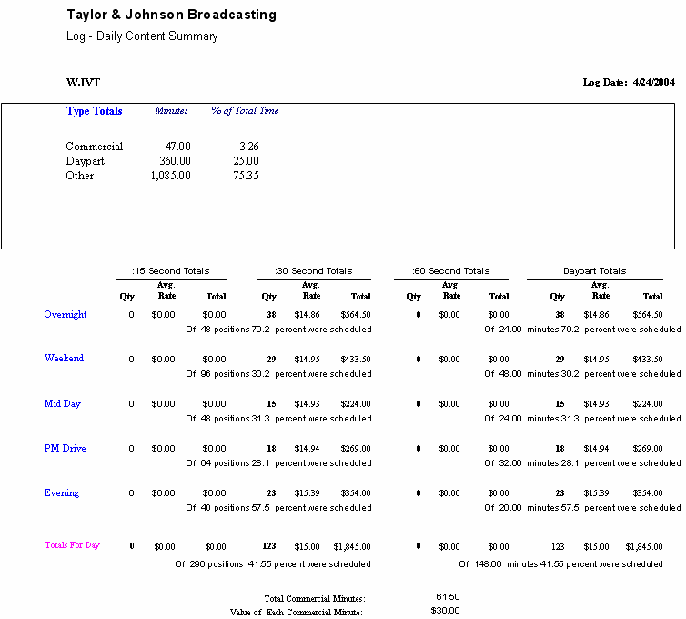 Use this report to print summarized minute and percentage totals for FCC Type Code content used on a particular log date as well as average rate, spot count, total dollars, and percentage of units and minutes sold for each daypart based on spot placement.