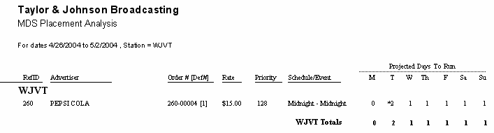 As MDS spots are moved by the VT Scheduler or manually moved by the user, this report will show where the spots are currently located at the time the report is run. Any day marked with an asterisk (*) signifies that the spot count includes spots that are currently bumped or deleted.