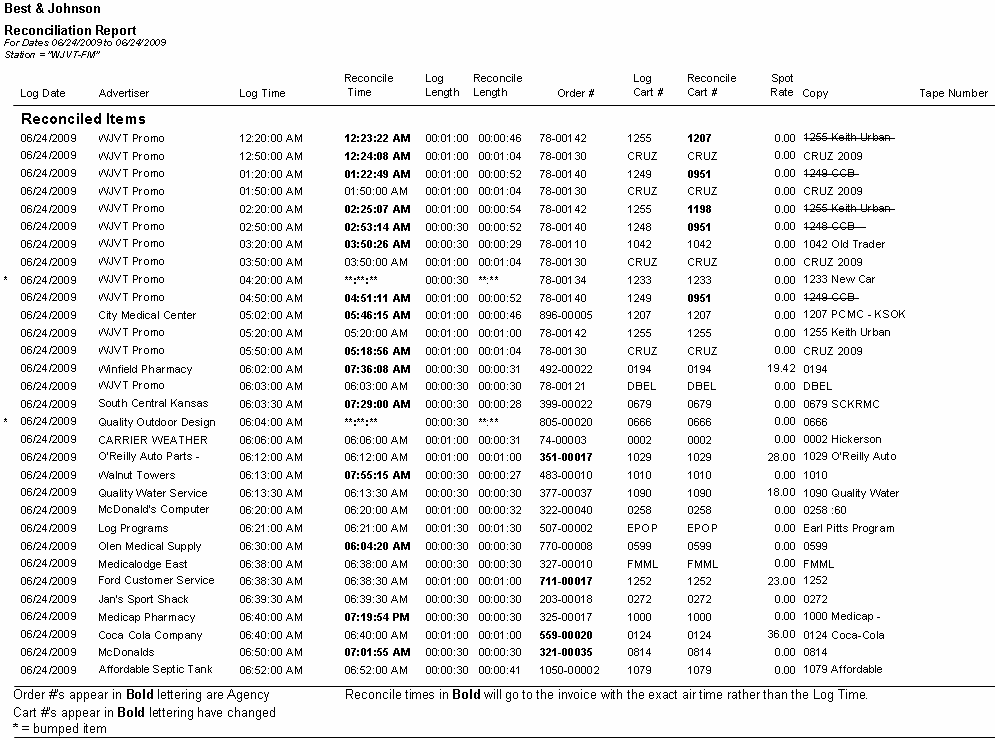 This report shows all logged VT spots for a given Station and date range between VT-logged Spot times and the Automation audit information. Both logged and actual air times are reflected. It also shows any unresolved discrepancies such as bumps, new items, and changed cart numbers created by the ELR process.