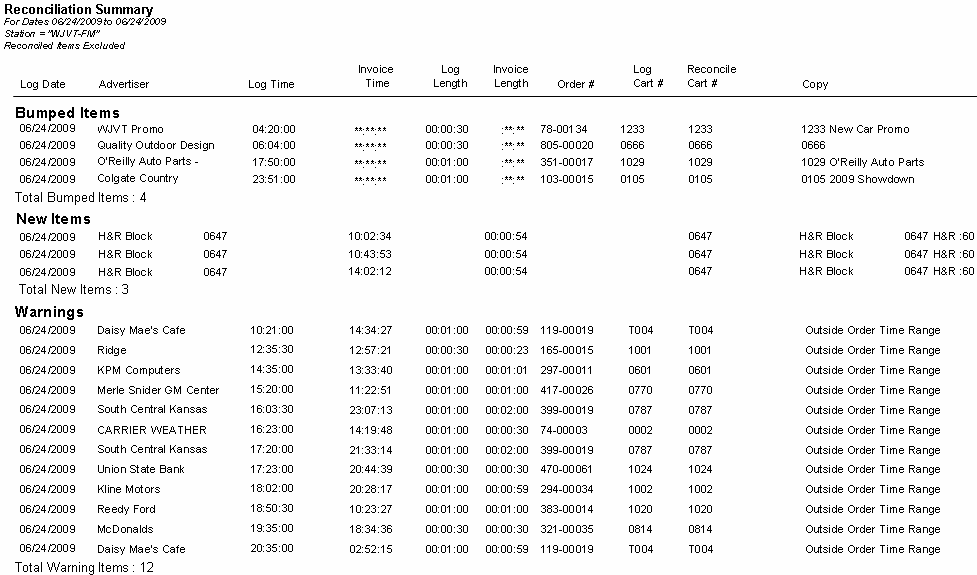 This report defaults to a summary which shows any unresolved discrepancies such as bumps, new items, and changed cart numbers created by the ELR process.