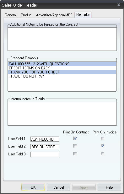 - Standard Remarks - Select any or all of your station's standard remarks by clicking once on the remark to highlight it. These remarks will be printed on the sales order, broadcast contract/ confirmation, and invoice.