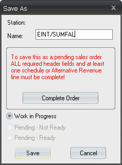 If you want to save the order as pending, you must first complete the header and at least one schedule line or alternative revenue item. If your header is currently incomplete, you can click the Complete Header button to open the header. If you do not have at least one completed schedule line, or if you have one or more incomplete schedule lines on the order, you can click the Complete Schedule Line button to return the cursor to the first incomplete schedule line.